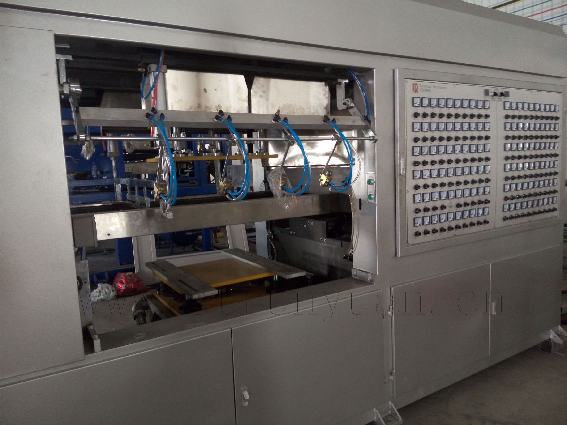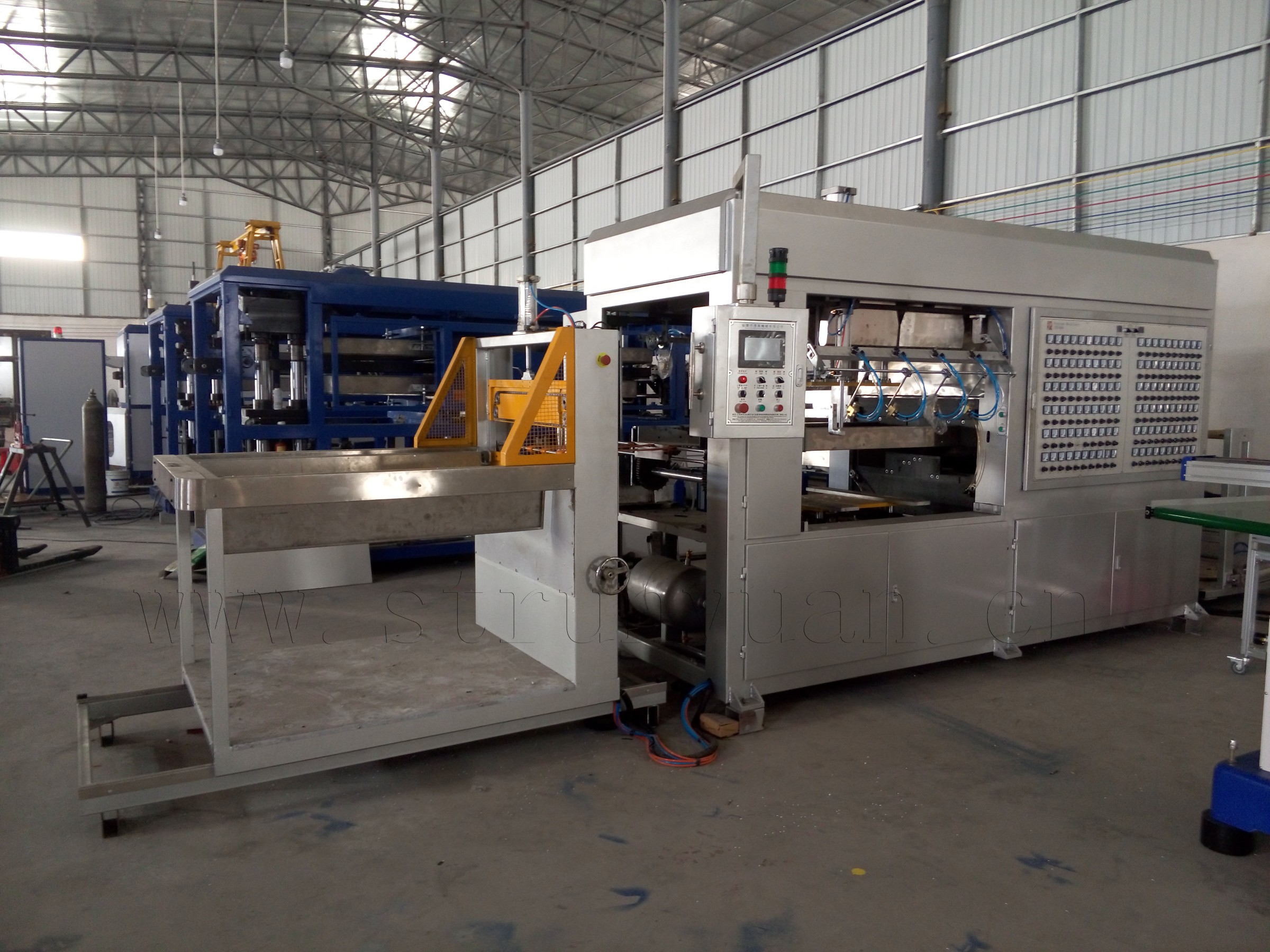 具有兩級(jí)真空功能,還具有二次上模、振動(dòng)脫模、延時(shí)真空等功能,適用于制造深度大的產(chǎn)品。本機(jī)可采用負(fù)?;蛘3尚?,更換模具方便快捷。采用中空遠(yuǎn)紅外加熱片上下加熱器進(jìn)行兩段加熱的加熱系統(tǒng)