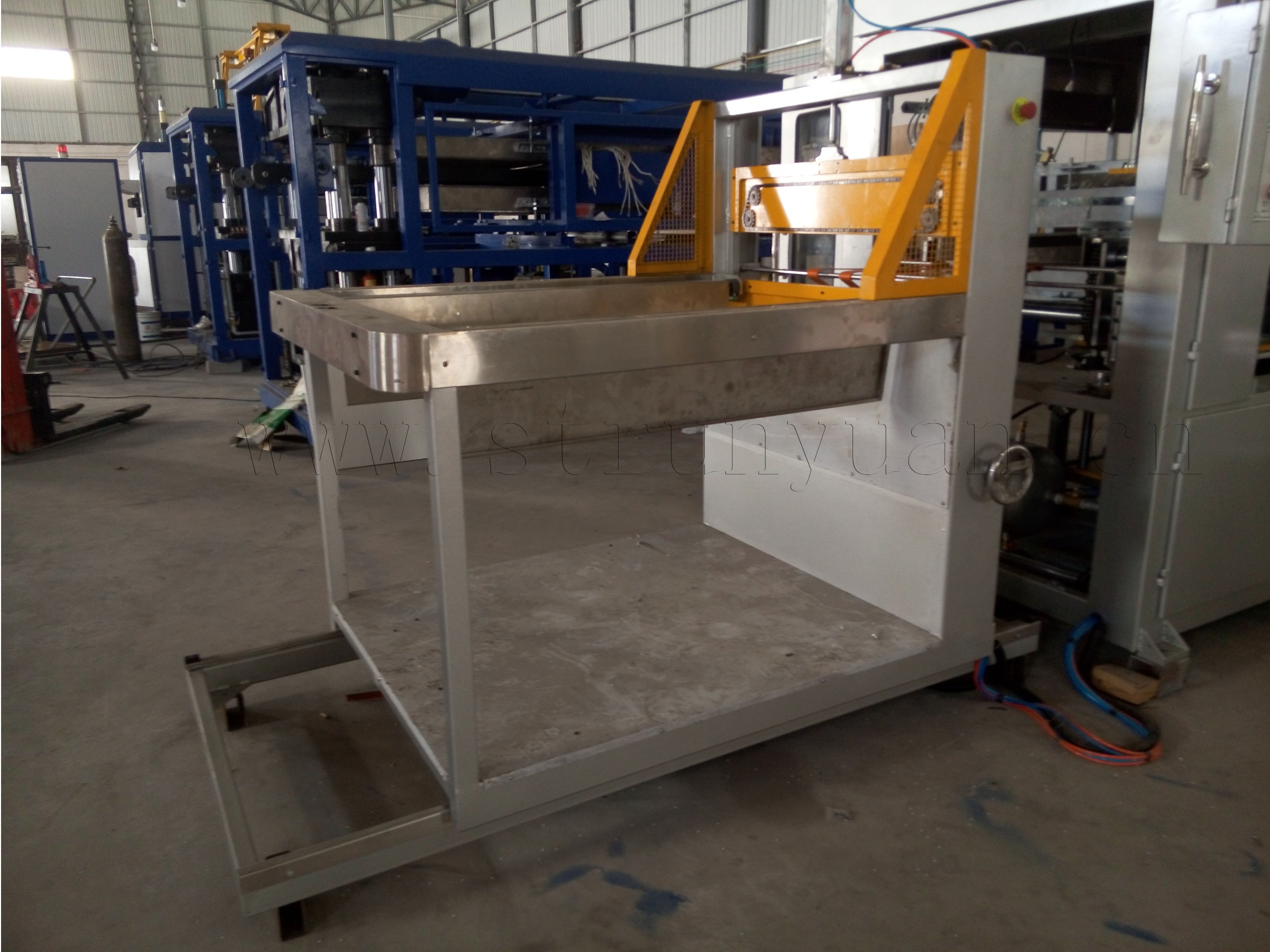 The machine is combined with pneumatic, mechanical and drive to achieve automatic continuous working of feeding sheet, forming, demoulding, ection cutting and stacking. Using PLC control system makes the machine working more reliable.